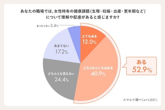 さらに、職場に女性特有の健康課題(生理・妊娠・出産・更年期など)への理解や配慮があるかを尋ねたところ、「どちらかといえばある」を含めると、半数以上が一定の理解や配慮を感じていると回答しました。