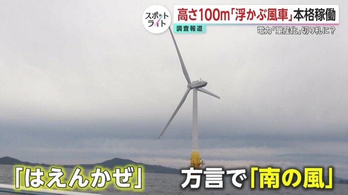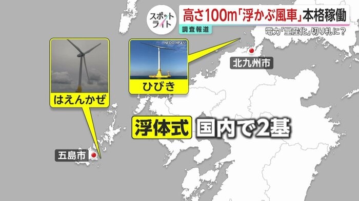 洋上風力発電には、風車を海底に固定させる「着床式」と、海に浮かべる「浮体式」がある。着床式が主流で、浮体式で商用運転しているのは、国内では「はえんかぜ」と北九州沖の「ひびき」の2基のみ。