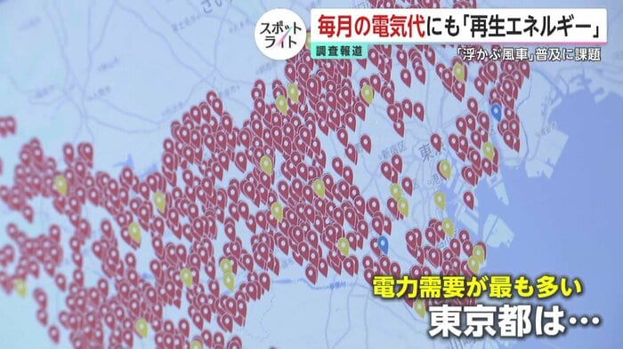 太陽光や、風力、地熱など種類ごとに色分けし、地図上に落とし込むと、電力需要が最も多い東京都ではほとんどが太陽光発電。バイオマス発電などもいくつかあるが、風力は三宅島の1カ所しかない。