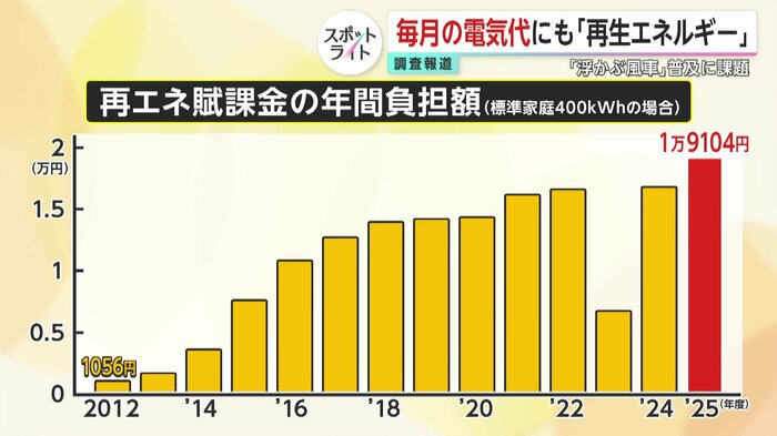 賦課金が導入された2012年度では、標準家庭で年1000円程度だった負担が年々上昇。いまや年額1万9000円以上になった。