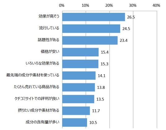 - 韓国の健康食品・サプリメントの使用意向者層が抱くイメージとしては、「効果が高そう」(26.5%)に加えて、「流行している」(24.5%)、「話題性がある」(23.4%)が上位を占めました。「話題性」や「流行」だけでなく、「効果が高そう」というイメージがトップである点から、韓国製品に対する期待の高さがうかがえます。(図2.)