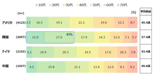 - 注目は、10-20代の若年層の動向です。「使いたい、今後使ってみたい健康食品・サプリメントがある」と回答した使用意向者層の年代構成比を生産国別にみると、「アメリカ」の10-20代の割合が20%であるのに対し、「韓国」では10-20代の割合が43%と他の国に比べ高くなっています。平均年齢が韓国では37.4歳と若い点も特徴的で、韓国コスメや美容医療などの韓国ブームは美容領域だけでなく、健康領域でも、若年層の消費行動に影響を与えている可能性を示唆しています。(図1.)