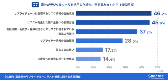 「貴社がデジタルツールを活用した場合、何を望みますか?(複数回答可)」に対しては、『サプライチェーンに影響するリスク情報の自動収集(46.2%)』がトップ、ほぼ同率で『リスクが発生した際の生産への影響分析(45.6%)』となりました。導入時の課題としてサプライチェーンやそれを取り巻くリスクの可視化が挙がり、デジタルツール活用で、生産への影響分析まで含め、その解決を望んでいることが伺えます。