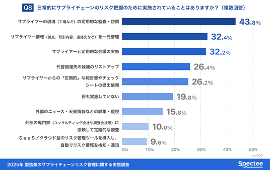 「日常的にサプライチェーンのリスク把握のために実施されていることはありますか?(複数回答可)」を伺ったところ、『サプライヤーの現場(工場など)の定期的な監査・訪問(43.8%)』が最多、『サプライヤーと定期的な会議の実施(32.2%)』も上位となっています。一方で、『SaaS/クラウド型のリスク管理ツールを導入し、自動でリスク情報を検知・通知(9.6%)』は1割にも満たず、実際にサプライヤーを監査・訪問したり、会議を行うといったアナログな方法が依然として主力のようです。