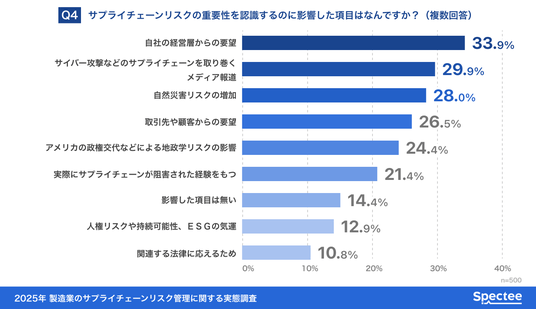 レジリエンス領域でDXを推進する株式会社Spectee(本社:東京都千代田区、代表取締役:村上 建治郎、以下 Spectee)は、製造業にお勤めの経営層とサプライチェーンに携わる業務担当者(合計500名)を対象に、「サプライチェーンリスク管理に関する実態調査」を実施しました。