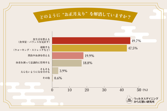 「食生活を整える(食事量・バランスを見直す)」が49.7%で最多。続いて「運動する(ウォーキングやストレッチなど)」(47.5%)が挙げられました。