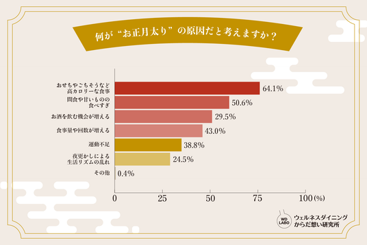 ・ 原因の1位は「おせちやごちそうなど高カロリーな食事」(64.1%)
