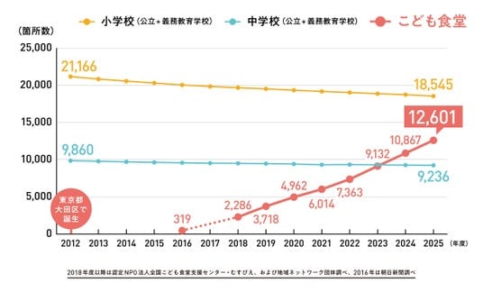 2025年度の調査では、こども食堂の箇所数は本年度も過去最高となる「1万2,601」カ所となりました(速報値)。2023年度から毎年連続して1,700カ所以上増えており、公立の小学校・義務教育学校を合わせた1万8,545校の7割に近づく結果となっています。