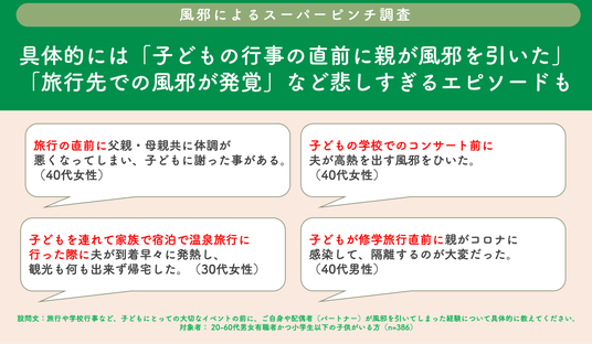 旅行や学校行事など、子どもにとっての大切なイベントの前に、ご自身や配偶者(パートナー)が風邪を引いてしまったエピソード