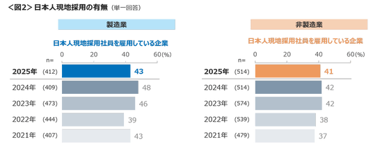 日本人現地採用社員を雇用していると回答した企業割合は、製造業で43%、非製造業で41%となり、前年より若干の減少が見られた。 <図2>