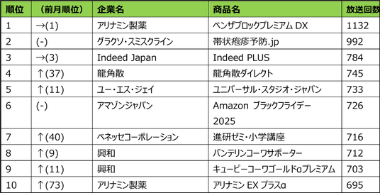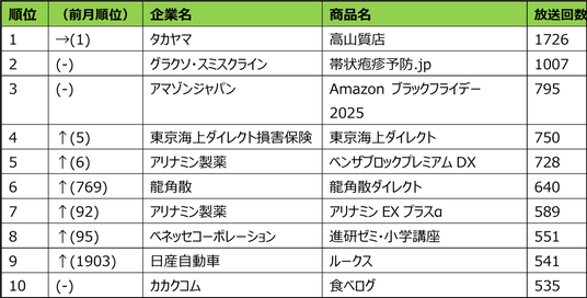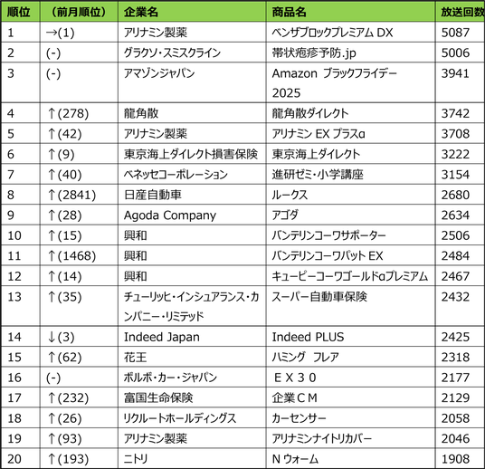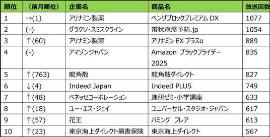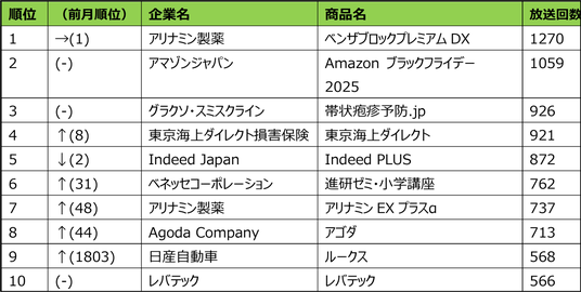 総合ランキングで1位から3位にランクインした、アリナミン製薬「ベンザブロックプレミアムDX」、アマゾンジャパン「Amazon ブラックフライデー 2025」、グラクソ・スミスクライン「帯状疱疹予防.jp」の3件は、全国的に大規模な出稿が見られました。