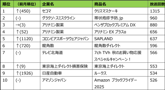2025年11月のテレビCM放送回数ランキングは、順位が大きく変動する結果となりました。1位は先月に引き続き、風邪の季節に向けたアリナミン製薬「ベンザブロックプレミアムDX」で、先月からの連続トップとなりました。一方、2位以下は大きく入れ替わっています。2位に新登場したのは、グラクソ・スミスクライン「帯状疱疹予防.jp」です。国の定期接種対象となった帯状疱疹の認知を図るCMが、全国的に大量に放送されました。3位には、定着した年末商戦イベントである、アマゾンジャパン「Amazon ブラックフライデー 2025」が新登場でランクインしました。クリスマスシーズンを前に、年末商戦が年々前倒しになっていることが伺えます。