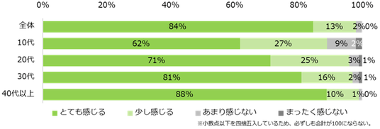 1:バイト探しをしている方の97%が、物価高の”家計への影響”を実感。9割が、物価高を受けて「もっと働いて収入を増やしたいと思った」。(図1~4)現在アルバイト・パート探しをしている方に「家計への”物価高”の影響を感じますか?」と質問すると、97%が「感じる」と回答(とても感じる:84%、少し感じる:13%)。雇用形態別では大きな差はありませんでしたが、年代別で見ると、年代が高くなるほど「感じる」と回答した方の割合が高くなりました(10代:89%、20代:96%、30代:97%、40代以上:98%)。