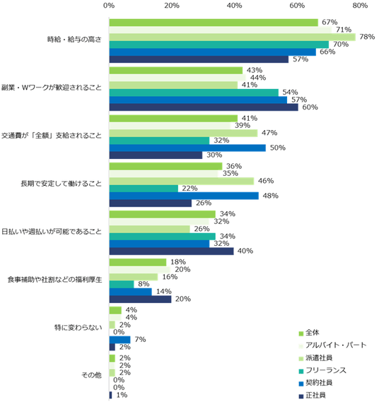 物価高を受けて、仕事探しで”以前より重視するようになった条件”を聞くと、上位は「給与・時給の高さ」(67%)、「副業・Wワークが歓迎されること」(43%)、「交通費が”全額”支給されること」(41%)でした。