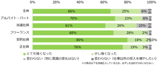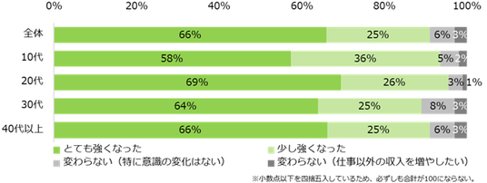 物価高を受けて、”もっと働いて収入を増やしたい”という気持ちが強まったかを伺うと、91%と大半が「強くなった」(とても強くなった:66%、少し強くなった:25%)と回答しました。