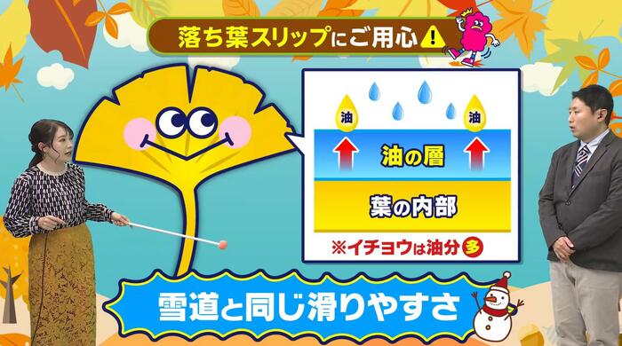 美しい落ち葉の絨毯も、雨が降ると危険なスリップの原因に変わってしまうのですね。古山予報士は、雨の日の運転ではスピードを落とし、安全運転を心がけるよう呼びかけていました。