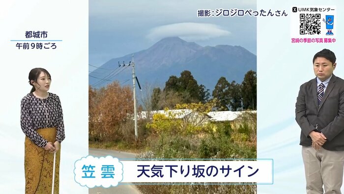 こちらは、都城市にお住まいの「ジロジロぺったんさん」が午前9時ごろに撮影した空の写真です。高千穂峰の上に、帽子のような雲がかかっています。これは「笠雲(かさぐも)」と言って、天気下り坂のサインとなっています。この雲が、雨が降ることを教えてくれていたのですね。