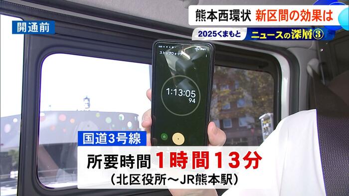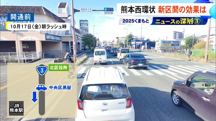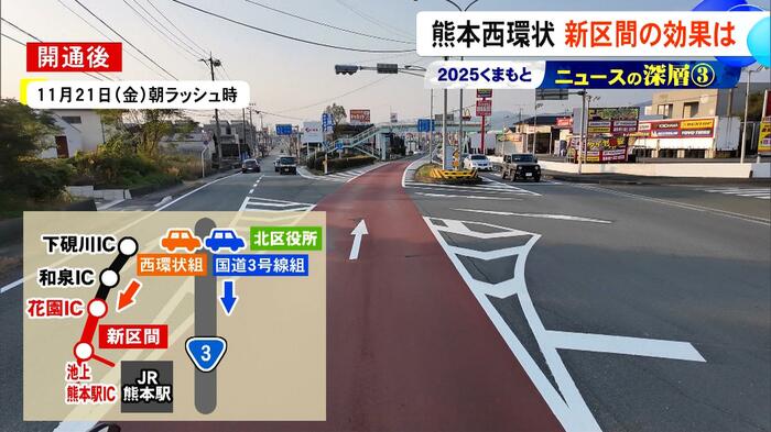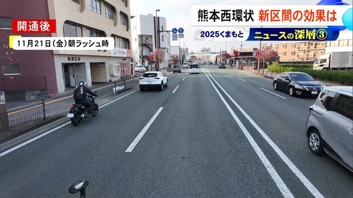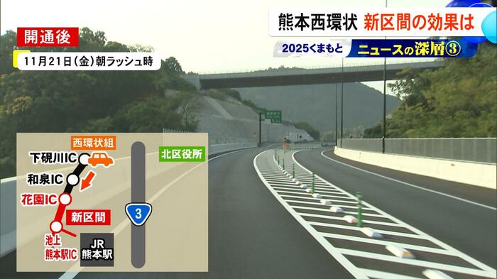 シリーズで伝える『くまもとニュースの深層』。今回は交通に関する問題、2025年10月に熊本市で熊本西環状道路の新たな区間が開通した。これにより熊本市の北部と西区のJR熊本駅が新たに結ばれることになった。この西環状道路の開通は熊本市の渋滞緩和に効果をもたらしたか、比較・検証を行った。
