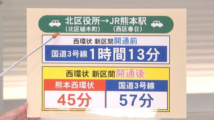検証では新区間開通前に熊本市北区役所から、熊本駅まで1時間13分かかった。