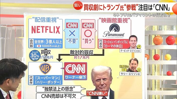 そこで登場してきたのがパラマウントです。「ミッションインポッシブル」「ローマの休日」などで有名ですが、約17兆円で“敵対的買収”に乗り出しました。どちらが買収していくのかという中で出てきた人物が、トランプ大統領でした。