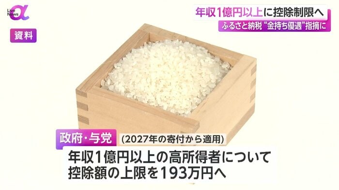 こうした指摘を踏まえ、政府・与党は見直しを検討していて、年収1億円以上の高所得者について、住民税から差し引かれる控除額の上限を193万円とし、2027年の寄付から適用する方向だ。
