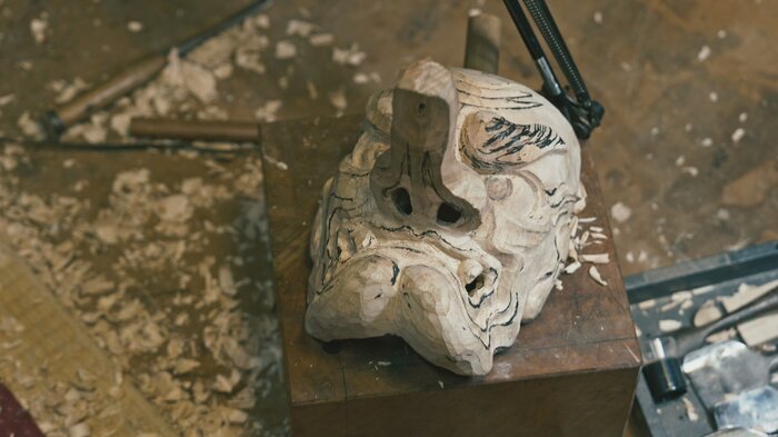 数十本もの彫刻刀を巧みに使い分け、木に命を吹き込んでいく。山崎さんは実際に自分で面をかぶって確認しながら作業を進める。「まだもっと削るけど俺のでかい顔でかぶれるんだったら誰でもかぶれるだろうなーと思って調整しています」と笑顔を見せた。