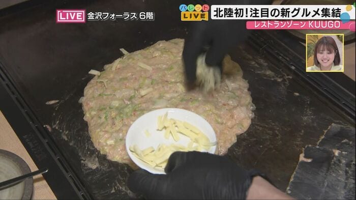 「トッピングは20種類以上ご用意していますので、お客様だけのオリジナルもんじゃを作ることもできます」と須山さん。この日はチーズをトッピングして、さらに風味豊かに仕上げた。