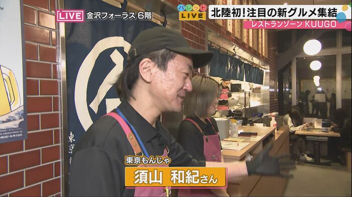 続いて訪れたのは「東京もんじゃ くらや」。店内に入るとジュージューという音と共に鉄板料理の香ばしい匂いが漂ってくる。東京もんじゃの須山和紀さんによると、もんじゃ焼きを中心に様々な鉄板料理を提供しているという。