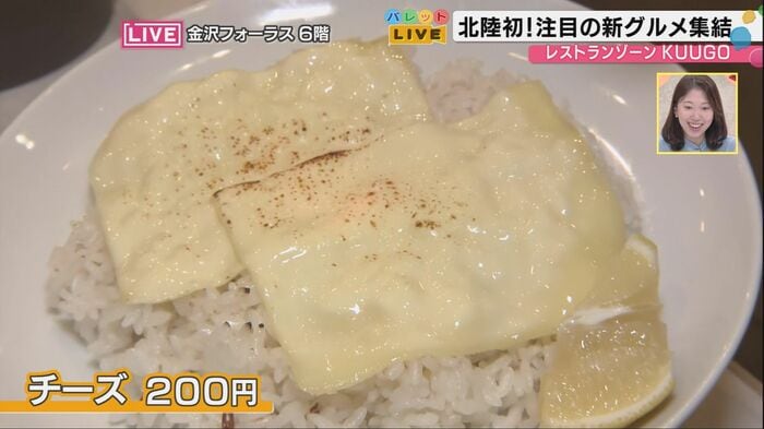 「普段はこのようなことはしないのですが、今回は特別にお見せします」と草野さんが笑顔で言いながら、ご飯の上に置かれたチーズにバーナーを当てると、チーズがとろけだし香ばしい香りが広がる。
