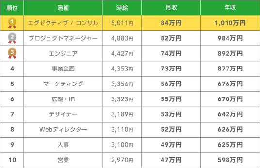 平均年収1,010万円(職種別年収ランキングトップ10中、1位)
