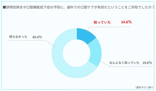 「誤嚥性肺炎や口腔機能低下症の予防に、歯科での口腔ケアが有効だということをご存知でしたか?」という質問に対し、「知っていた」と答えた人はわずか14.6%という結果になりました。65.4%の人は「知らなかった」と回答しています。