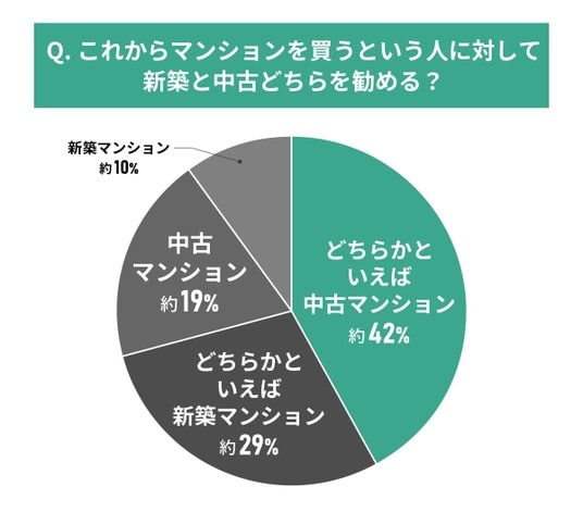 これからマンション購入を検討している人に対して、新築と中古のどちらを勧めるかについても調査しました。回答者自身の経験や市場分析に基づいた意見が集まっています。