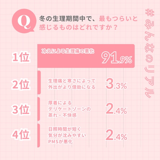 結果:「冷えによる生理痛の悪化」91.9%、「外出が億劫になる」3.3%、「厚着による蒸れ・不快感」2.4%、「日照時間の短さ・PMS悪化」2.4%