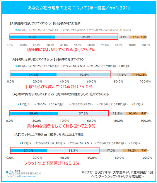 今回の調査から、理想の上司像として「積極的なコミュニケーション」「丁寧な指導」「具体的な指示」「フラットな関係性」を求める傾向が明らかになりました。