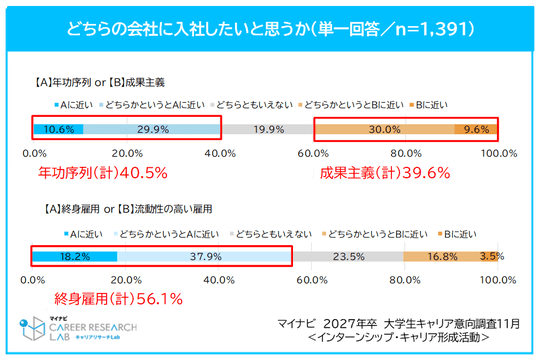 評価方法に関しては、「年功序列」か「成果主義」のどちらの制度がある会社に入社をしたいか聞くと、「年功序列(40.5%)」、「成果主義(39.6%)」となり、ほぼ同じ割合となった。
