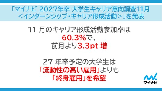 11月のキャリア形成活動参加率は60.3%で、前月より3.3pt増。27年卒予定の大学生は「流動性の高い雇用」よりも「終身雇用」を希望