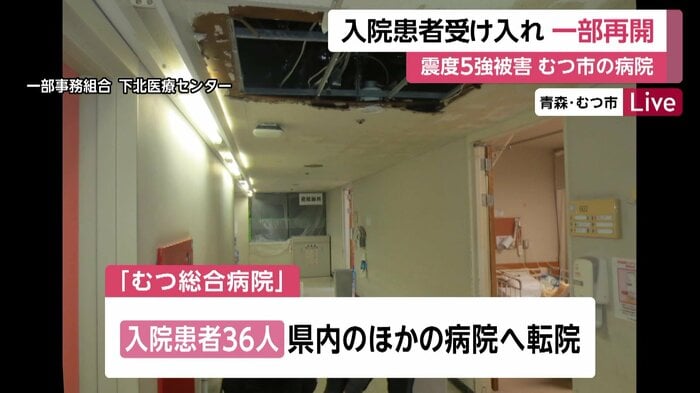 8日に震度5強を観測したむつ市にある「むつ総合病院」は、地域医療の中枢を担っていますが、地震の影響でスプリンクラーが破損し浸水被害に遭うなどして、入院患者36人が県内のほかの病院への転院を余儀なくされた。