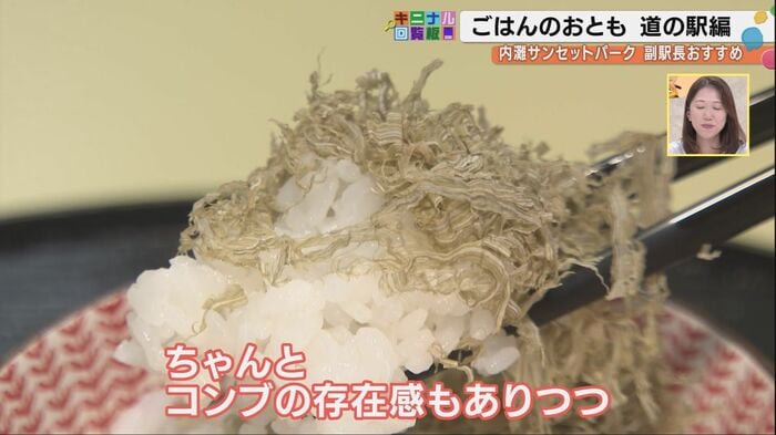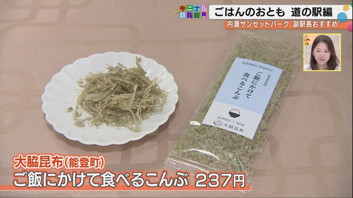 道の駅には、「ふんわりできる卵焼きこんぶ」「納豆にかける玄米入りこんぶ」など、用途別に多彩な昆布製品が揃っている。能登町で昔からの伝統と技にこだわって手作りで削っている昆布だ。試食したのは「ご飯にかけて食べる昆布」は特に人気だ。酢を使わず醤油で味付けしたとろろ昆布だ。