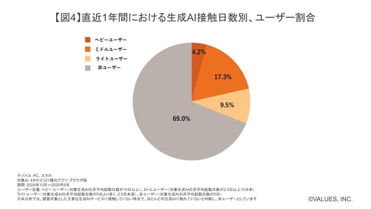 直近1年間の利用頻度を見ると、生成AIを利用しない「非ユーザー」は69.0%を占めており、普及の余地は依然として大きい状況です。対して、月平均起動日数が10日以上の「ヘビーユーザー」は全体の4.2%にとどまっています。