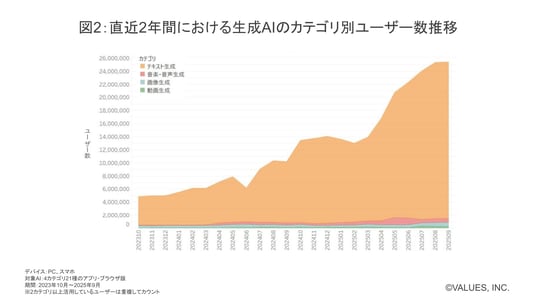 一方で、その他のカテゴリも推移に変化が見られます。2024年3月頃までは「画像生成」が優勢でしたが、その後「音楽・音声生成」が急拡大し、2025年9月には約61万人と画像生成(約65万人)に迫る規模となりました。また、2025年7月頃からは「動画生成」AIも急拡大しており、今後の動向が注目されます。