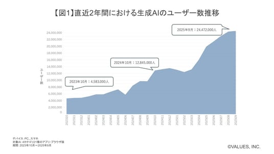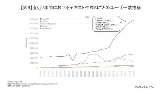 テキスト生成AIではChatGPTが圧倒的で、2025年に入ってからユーザー数をさらに伸ばし、9月には1,920万人を記録しました。