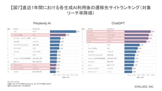 一方で特徴的な動きを見せるのがPerplexity AIです。他サービスと異なり、利用後の遷移先として「YouTube」、「Amazon.co.jp」などが上位になく、「Yahoo!知恵袋」などのYahoo!系サイトがランクインしています。今後、Perplexity AIがYahoo!サービスのハブとなっていく可能性も考えられます。