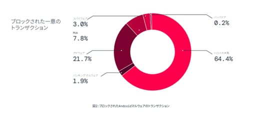 - アドウェアがモバイル脅威全体の69%を占め、Jokerマルウェア ファミリーを上回る結果に。一方、Jokerは昨年の38%から23%に減少