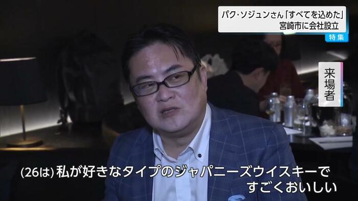 韓国の人気俳優パクソジュンさんが監修し、宮崎県木城町の尾鈴山蒸留所が製造するウイスキー「26」が新たな展開を迎えている。2024年に発売された「26」は1万本が即座に完売するほどの人気を博した。このプロジェクトのきっかけを作ったのは、ウイスキーの販売元であるSTARBASEの日高良太郎社長(延岡市出身)。今回、STARBASEとパクソジュンさんが共同で宮崎市に新会社「1216」を設立し、東京でレセプションパーティーが開催された。