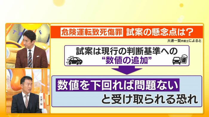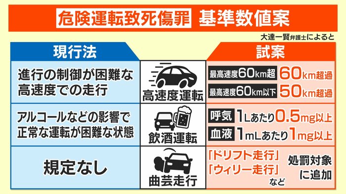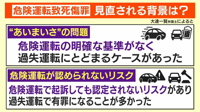 現在、危険運転致死傷罪が適用されるのは、「進行を制御することが困難な高速度」「アルコールの影響で正常な運転が困難な状態」などとされていて「規定があいまいだ」という批判の声がありました。