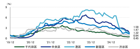 区別の空室率は、中央区が前月比マイナス0.68ポイントの1.58%と大幅な低下で、2021年3月以来の1%台となった。千代田区は11ヵ月連続、渋谷区は2ヵ月連続で1%を下回り、コロナ禍前と同様の極めて低い水準で推移している。