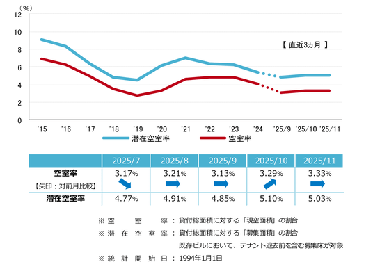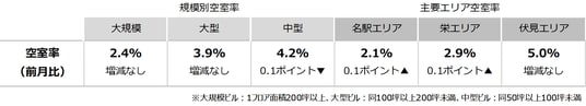 空室率は前月比プラス0.04ポイントの3.33%となり、2ヵ月連続で小幅な上昇となった。周辺エリアで大口の現空床が生じた一方、館内増床や立地改善目的の移転等で空室床の消化が進み、前月からはわずかな動きとなっている。潜在空室率は前月比マイナス0.07ポイントの5.03%だった。