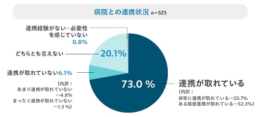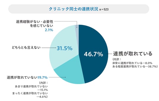 クリニック同士の連携の実態を見てみると、「連携が取れている」(非常に連携が取れている+ある程度連携が取れている)と答えた人は46.6%と約半数。中でも「非常に」連携が取れているのはわずか8.0%で、全体の1割以下にとどまる結果に。