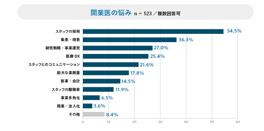 【開業医の悩み】医師全体の54.5%が「スタッフの採用」に悩み