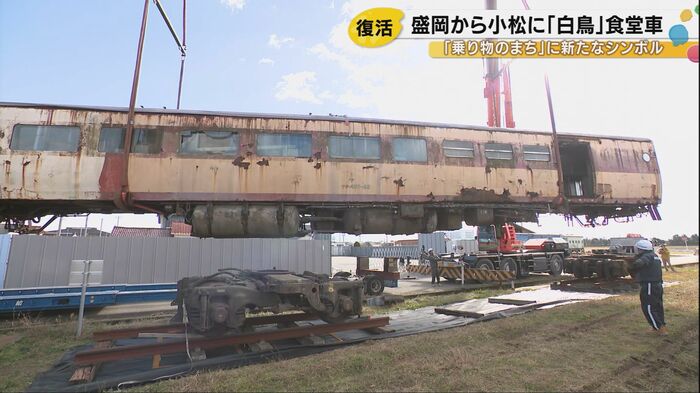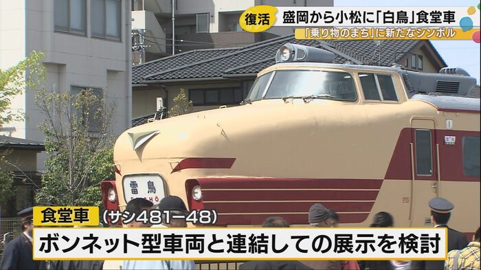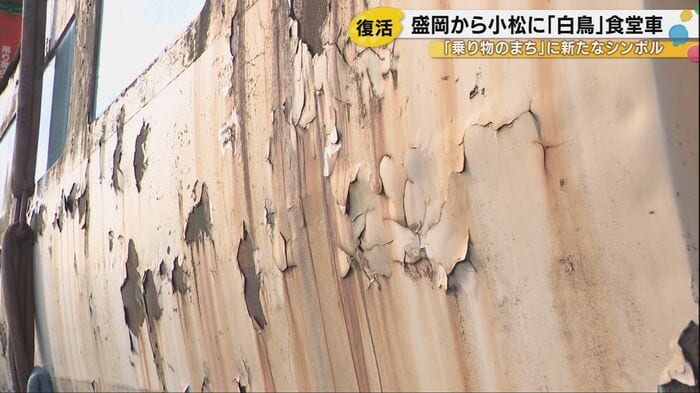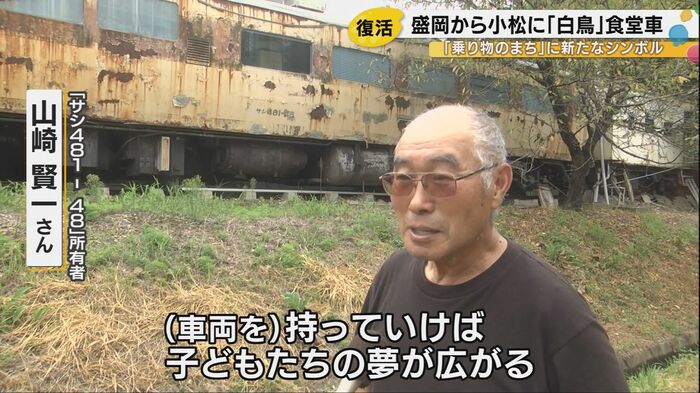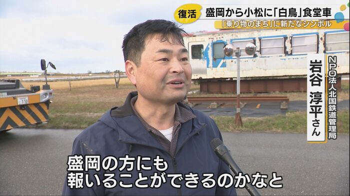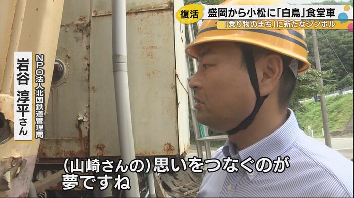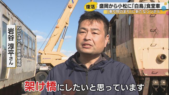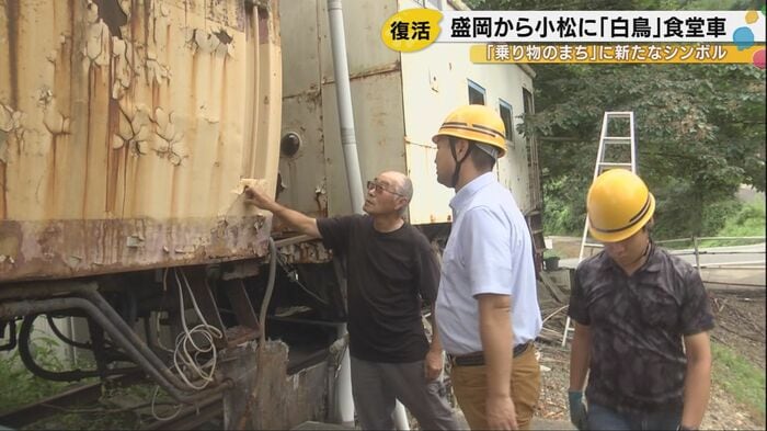 岩谷さんが運営するNPO法人では、これまでにもボンネット型の特急車両を復元し、小松市内の公園に展示する取り組みを行ってきた。岩谷さんは食堂車を修繕した後、最終的にはボンネット型の車両と連結する形で展示することを目指している。